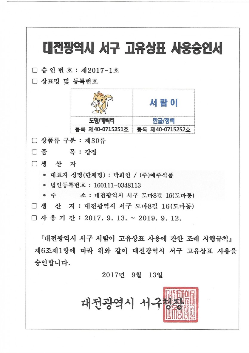 제2017-1호 대전광역시 서구 고유상표 사용승인서